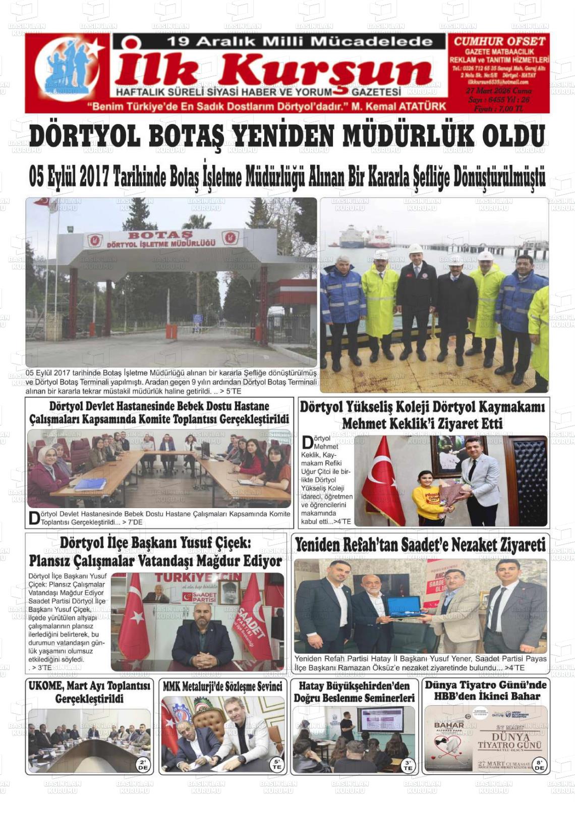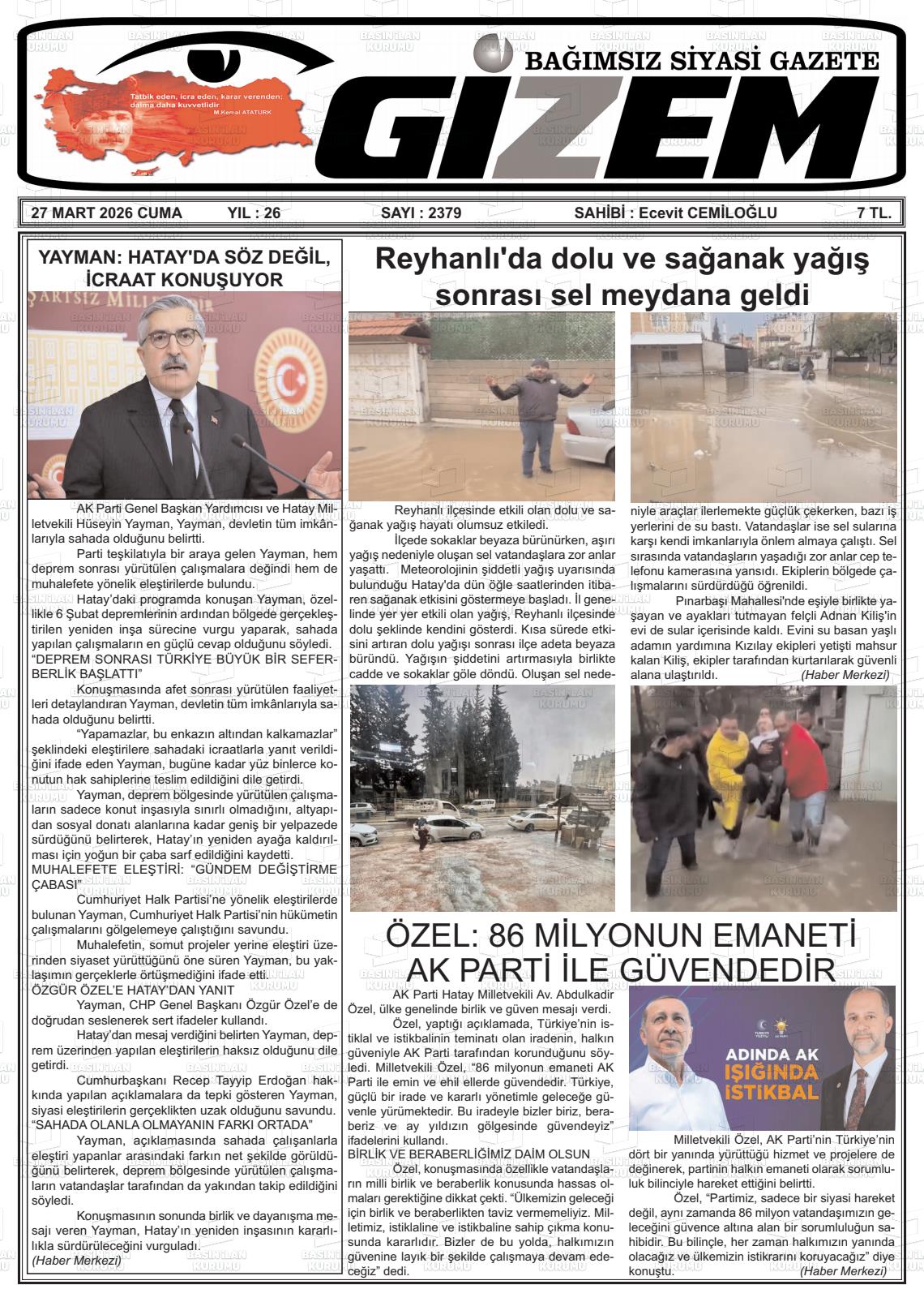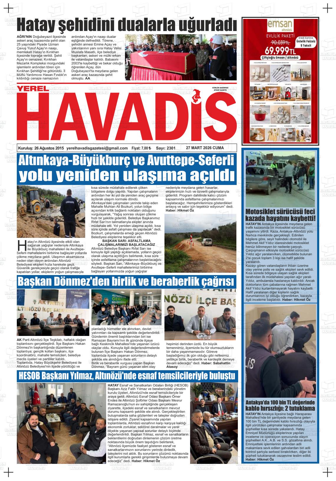 Hatay Yerel Gazeteleri 27 Mart 2026, Cuma Günü Manşeti
